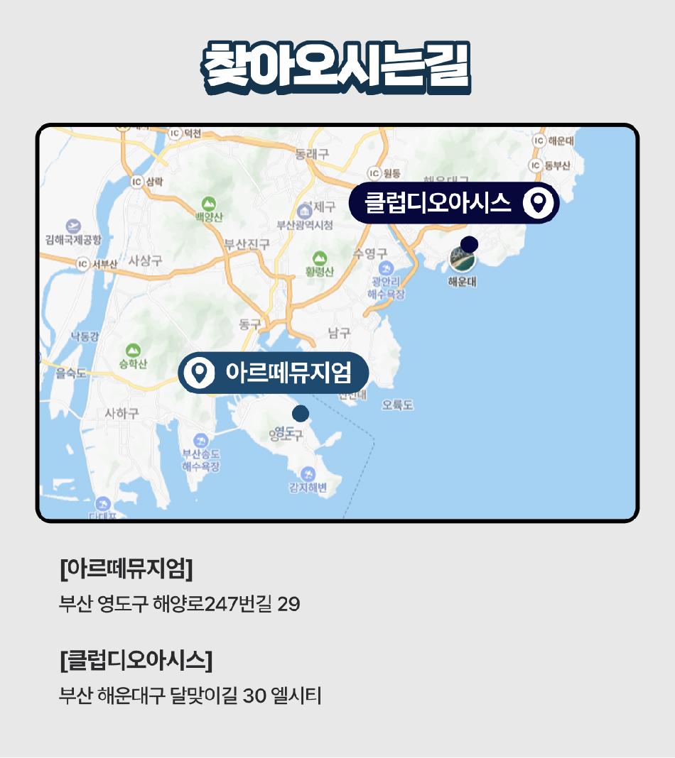 * 운영시간 - 매일 : 10:00~20:00 * 휴무일 : 연중무휴 * 주차 : 해당없음 * 주차여부 : 관람 시 2시간 무료 주차 가능 (지정 주차장 이용 필수 *영도구 동삼동 201-87) - 전시관에서 주차 등록 필수입니다. (2시간 초과 시 10분 당 500원) - 주차장이 협소하여 대중교통 이용을 추천합니다. - 대중교통 : 17번, 186번 [아르떼뮤지엄/미창석유] 정류장 하차 * 무료입장기준 : 2023년 이후 출생자 - 성인 보호자 1인당 2명까지 무료 입장 가능 / 가족은 제한 없음 / 증빙서류 필수 * ※ 운영정보는 현장 상황에 따라 변동될 수 있습니다.