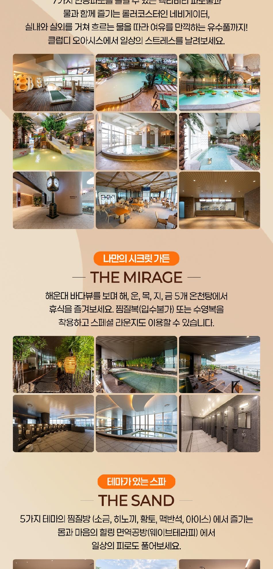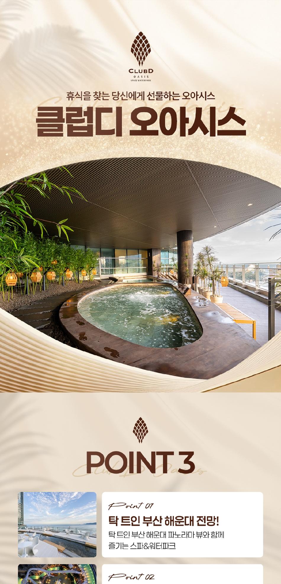 클럽디오아시스 유의사항 * (통합권) 워터파크를 이용하실 때는 모자(캡모자 가능), 아쿠아슈즈(물놀이를 위한 전용슈즈) 필수 착용해 주셔야 합니다. * 상품에 기재되어 있는 기본 이용시간 초과 시 추가요금(시간당 10,000원)이 발생됩니다. * 손님이 많을 경우 쾌적한 이용을 위한 ‘입장제한’으로 바로 입장하지 못 할 수 있습니다. * 이용 시간 및 시설 운영은 현장 상황에 따라 상이할 수 있으니 사전에 이용 관련 사항을 확인해 주시기 바랍니다. * 청수당(야외스파)에서 수영복 또는 래쉬가드 착용 시 입욕 가능합니다. * 찜질복 착용 시에는 족욕만 가능합니다. (일반 면티/면바지 입욕 불가) * 고객 여러분의 안전을 위하여 부력제가 없는 튜브형 구명조끼는 이용이 불가합니다. (팔에 끼는 공기주입형 보조기구 포함) * 안전하고 즐거운 이용을 위하여 아래 물품의 반입을 제한하고 있습니다. - 음식물, 돗자리, 유리 소재의 모든 제품, 스노클 장비(스노클용 물안경 포함), 오리발, 다이버 마스크, 애완동물, 대형 물놀이 기구(가로 /세로 각 1m이상), 유모차, 웨건, 수레, 카트(바퀴가 달린 운반 수단) 등 - ( 물품 외 손님의 안전과 풀 위생을 저해하는 물품도 반입 제한 및 보관 요청을 받으실 수 있습니다.) * 모든 외부 음식은 반입 금지입니다. 지참하신 음식물은 음식물 보관소에 보관하여 주시기 바랍니다. - 아이 유아식 및 일부 섭식장애 (알러지성 등) 고객을 위한 특별식은 안내 요원에게 따로 요청하여 주시기 바랍니다. * 입장 시 모든 주류 반입은 금지되며 시설 내에서 판매되고 있는 주류는 지정된 장소에서만 이용 가능합니다. * 내부 체험시설의 경우 기종 특성에 따라 지정된 복장을 착용하지 않으면 이용이 제한됩니다. - 바디슬라이드: 래쉬가드, 금속성 및 플라스틱 후크가 달린 수영복, 레깅스 티셔츠(소재불문), 금속이 부착된 수영복 및 비치바지, 랩스커트 착용시 이용제한 - 튜브형 슬라이드 : 날카로운 장식물이 달린 수영복, 귀걸이,목걸이,피어싱,팔찌, 모자, 안경, 선글라스 등 신체에 상해를 입힐 수 있는 복장은 이용제한 * 안전한 물놀이를 위하여 전염성 질환을 가진 손님은 입장하실 수 없습니다. * 어린이 및 노약자는 부상의 위험이 있어 일부 놀이시설의 이용이 제한될 수 있습니다. * 공중위생관리법 4조 7항의 시행규칙에 따라 목욕실 및 탈의실에 만 4세(48개월) 이상의 남, 여는 동반 입장이 불가합니다. * 음주자 및 타인에게 피해를 주는 행위를 하는 자는 입장할 수 없으며, 이용을 제한할 수 있습니다. * 타인에게 혐오감을 줄 수 있는 과도한 문신을 하신 손님은 입장 및 이용이 제한될 수 있으니 겉옷을 착용하거나 근무자의 안내에 따라 주시기 바랍니다.