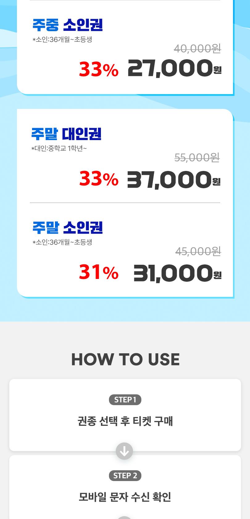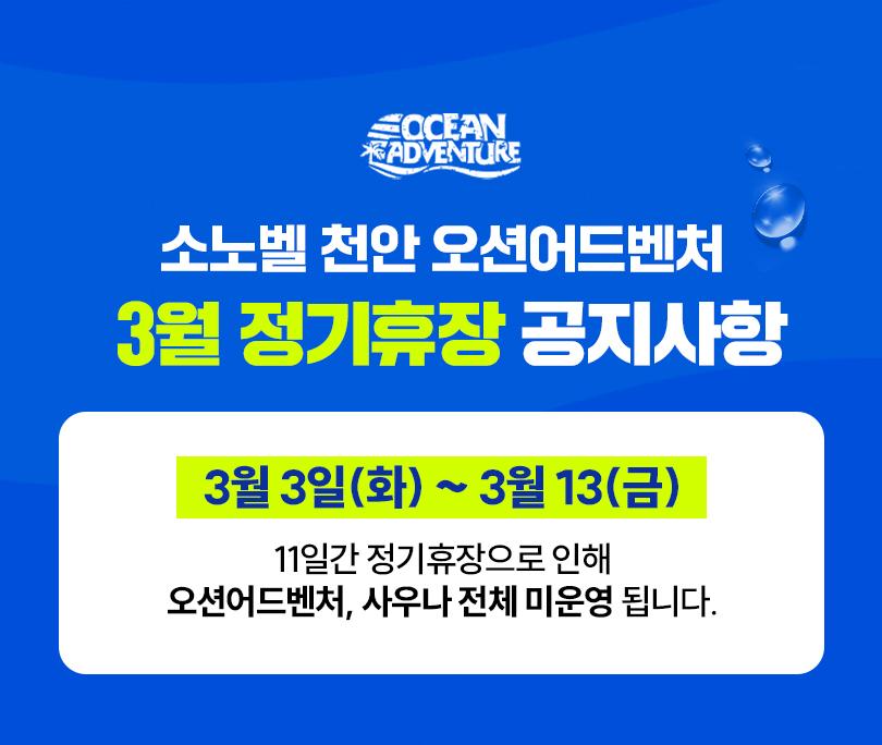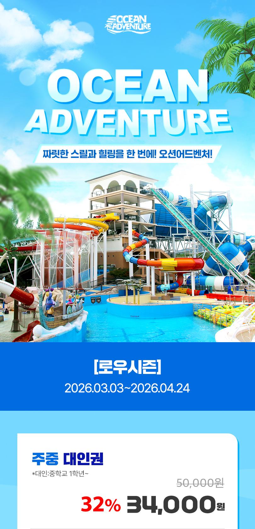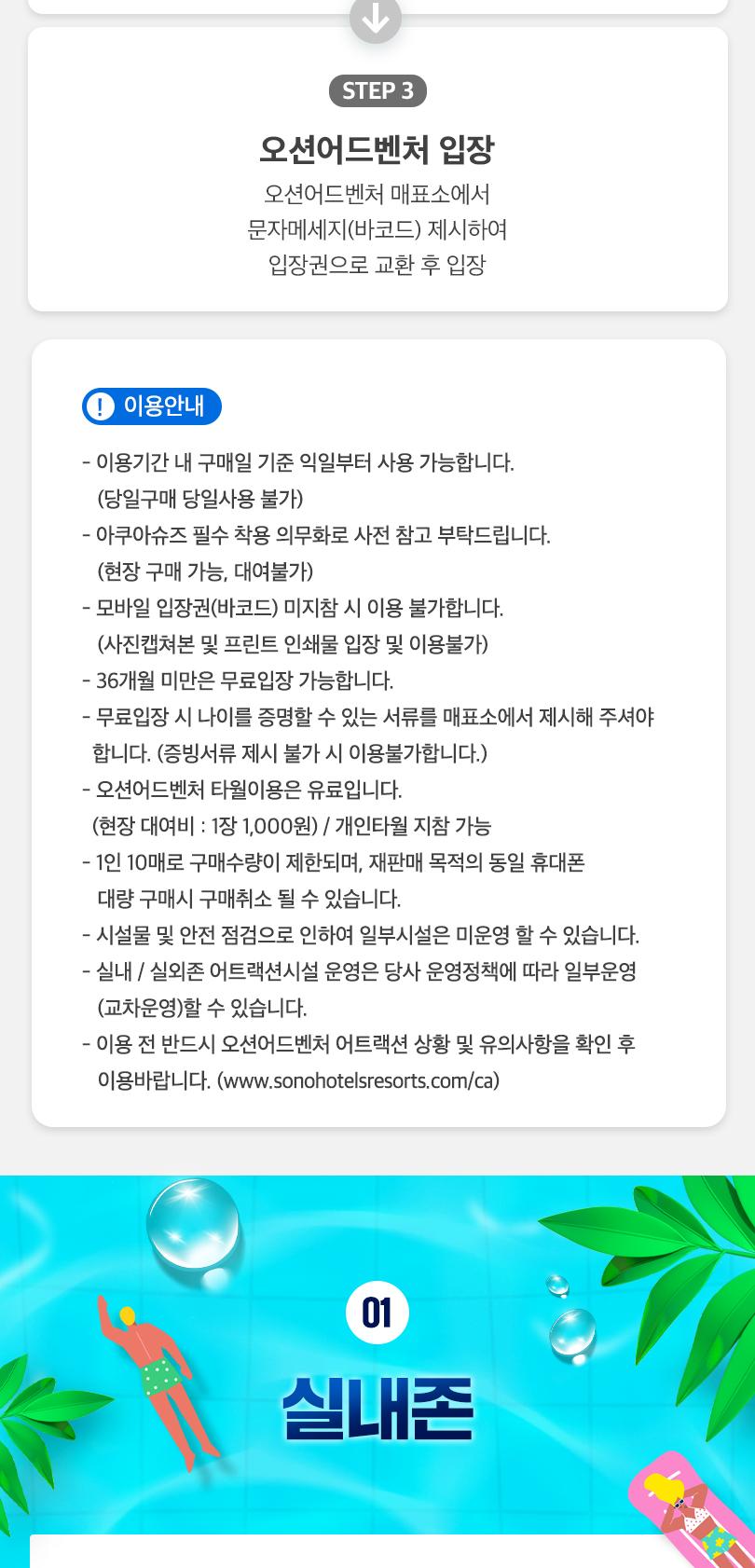 * 3/3 ~ 3/13일 휴장으로 이용 전 참고 부탁드립니다. * 3/17 ~ 4/29 매주 화 수 클린데이로 미운영됩니다. * 이용기간 내 구매일 기준 익일부터 사용 가능합니다. (당일구매 당일사용 불가) * 수영복(비치웨어,레쉬가드) 착용 필수, 수모(두건, 야구모자) 착용 및 아쿠아 슈즈 착용 권장 * 비 오는 날에도 정상 영업합니다. 단, 낙뢰 등 기상상황에 따라 일부 시설 이용은 제한될 수 있습니다. * 모바일 입장권(바코드) 미지참 시 이용 불가합니다. (사진캡쳐본 및 프린트 인쇄물 입장 및 이용불가) * 36개월 미만은 무료입장 가능합니다. * 무료입장 시 나이를 증명할 수 있는 서류를 매표소에서 제시해 주셔야 합니다. - (증빙서류 제시 불가 시 이용불가합니다.) * 오션어드벤처 타월이용은 유료입니다. (현장 대여비 : 1장 1,000원) / 개인타월 지참 가능 * 1인 10매로 구매수량이 제한되며, 재판매 목적의 동일 휴대폰 대량 구매시 구매취소 될 수 있습니다. * 시설물 및 안전 점검으로 인하여 일부시설은 미운영 할 수 있습니다. * 실내 / 실외존 어트랙션시설 운영은 당사 운영정책에 따라 일부운영(교차운영)할 수 있습니다. * 이용 전 반드시 오션어드벤처 어트랙션 상황 및 유의사항을 확인 후 이용바랍니다. - (www.sonohotelsresorts.com/ca)
