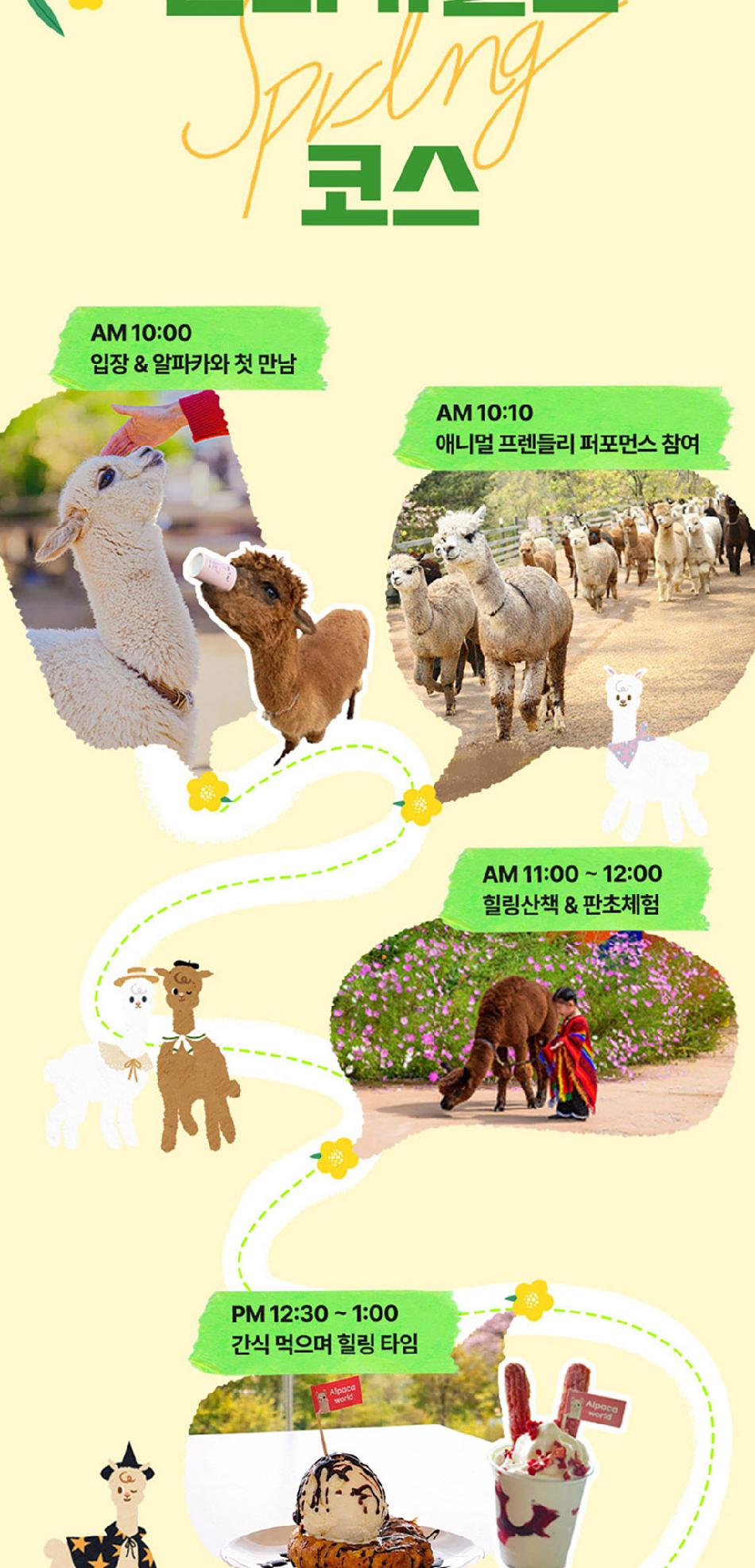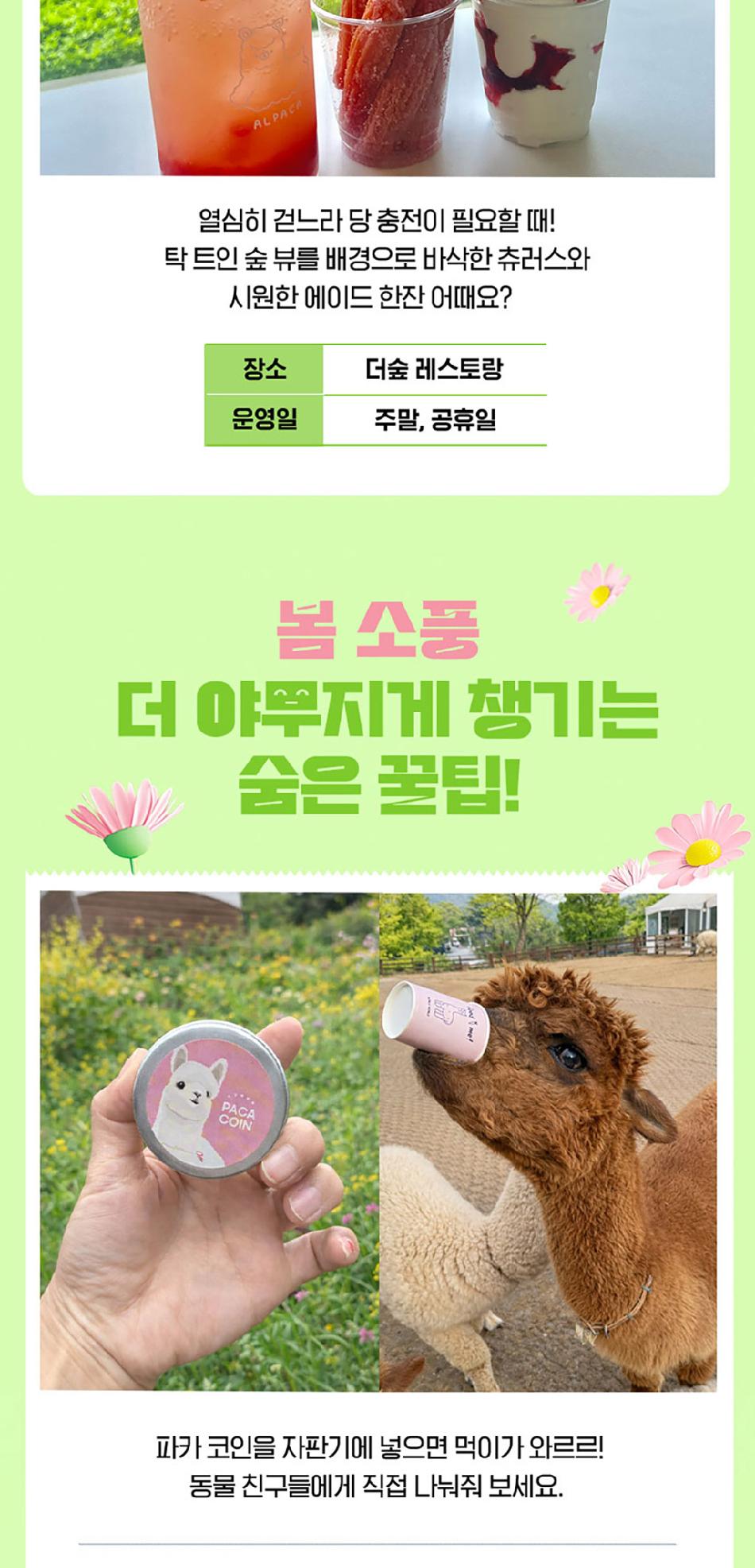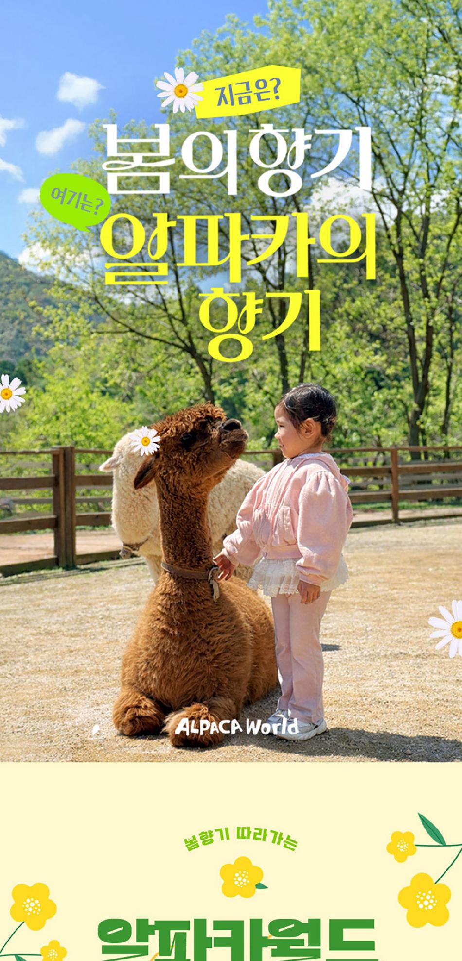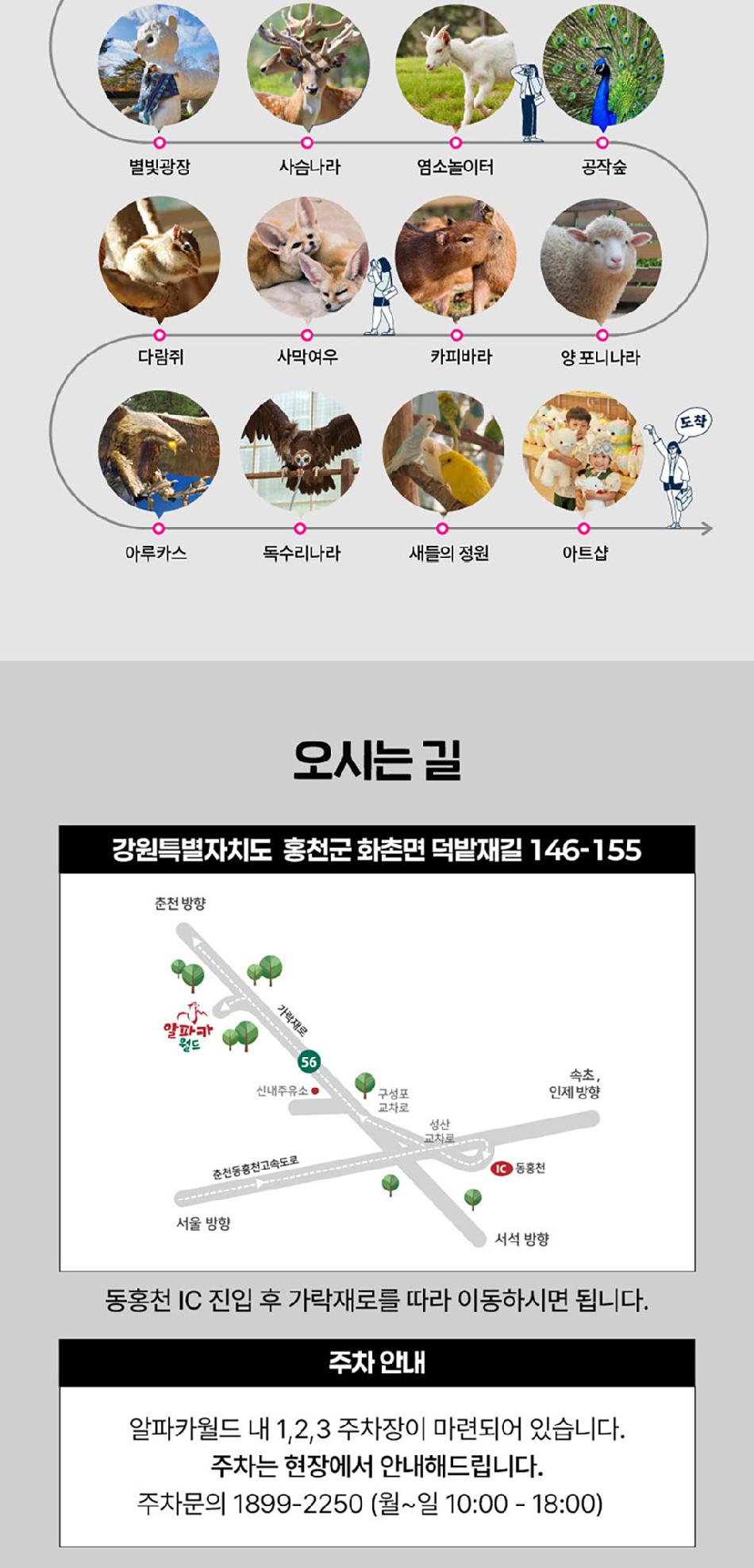 알파카월드 안내사항 * 알파카야 이리와 이벤트는 매일 오전 10시 10분에 시작이며, 10시까지 입장해주셔야 참여 가능합니다. * 동물들의 안전을 위해 음식물 및 반려동물의 출입이 제한됩니다.(맹인 안내견 제외) * 분실물 문의는 1899-2250으로 연락 주시면 신속하게 처리해 드리겠습니다. * 동물 알레르기가 있으신 분들은 체험 보다는 관람 하시는 것을 권유드립니다. * 주차공간이 충분히 마련되어 있으며 주차비는 무료입니다. * 알파카와 힐링산책은 현장에서 별도 구매가 필요합니다. * 먹이체험시, 필요한 먹이는 파카코인 구매 후 코인을 이용해 구매부탁드립니다. - (파카코인 1개당 먹이주기 체험 1회분) * 파카코인은 매표소(카드,현금 가능)/체험존파카코인교환기(현금만가능) 통해 구매 가능 - (1,000원당 파카코인1개 지급) * 경로우대 및 복지카드 소지자는 현장에서 입장권을 구매해주시기 바랍니다.