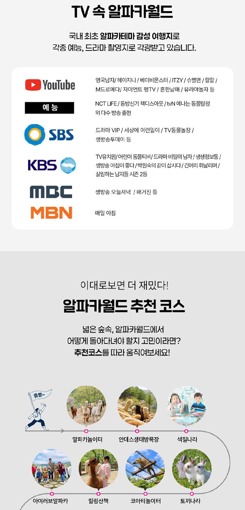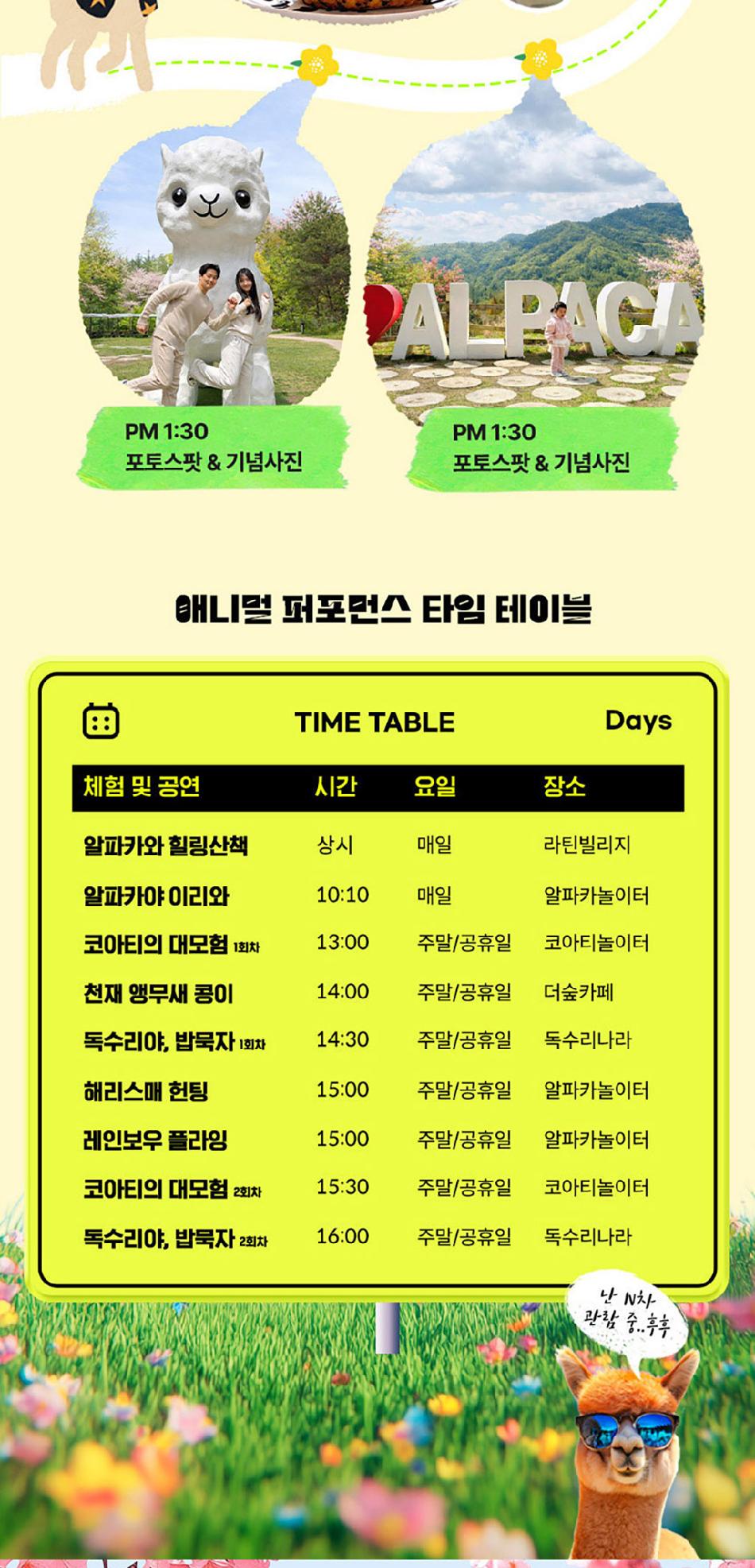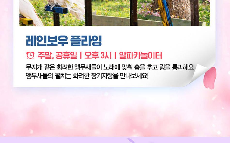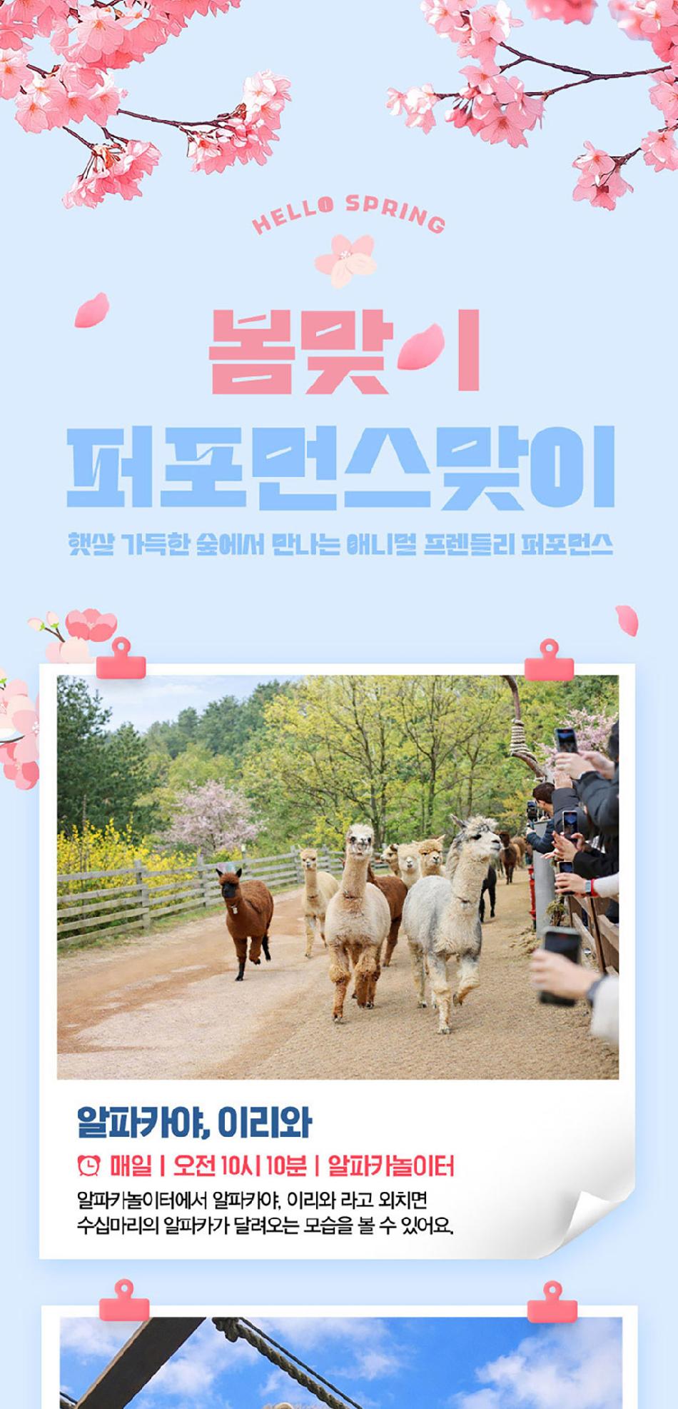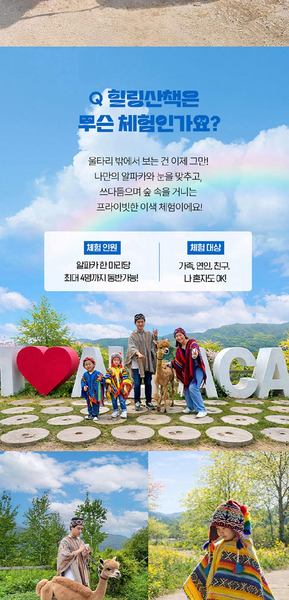 알파카월드 안내사항 * 알파카야 이리와 이벤트는 매일 오전 10시 10분에 시작이며, 10시까지 입장해주셔야 참여 가능합니다. * 동물들의 안전을 위해 음식물 및 반려동물의 출입이 제한됩니다.(맹인 안내견 제외) * 분실물 문의는 1899-2250으로 연락 주시면 신속하게 처리해 드리겠습니다. * 동물 알레르기가 있으신 분들은 체험 보다는 관람 하시는 것을 권유드립니다. * 주차공간이 충분히 마련되어 있으며 주차비는 무료입니다. * 알파카와 힐링산책은 현장에서 별도 구매가 필요합니다. * 먹이체험시, 필요한 먹이는 파카코인 구매 후 코인을 이용해 구매부탁드립니다. - (파카코인 1개당 먹이주기 체험 1회분) * 파카코인은 매표소(카드,현금 가능)/체험존파카코인교환기(현금만가능) 통해 구매 가능 - (1,000원당 파카코인1개 지급) * 경로우대 및 복지카드 소지자는 현장에서 입장권을 구매해주시기 바랍니다.