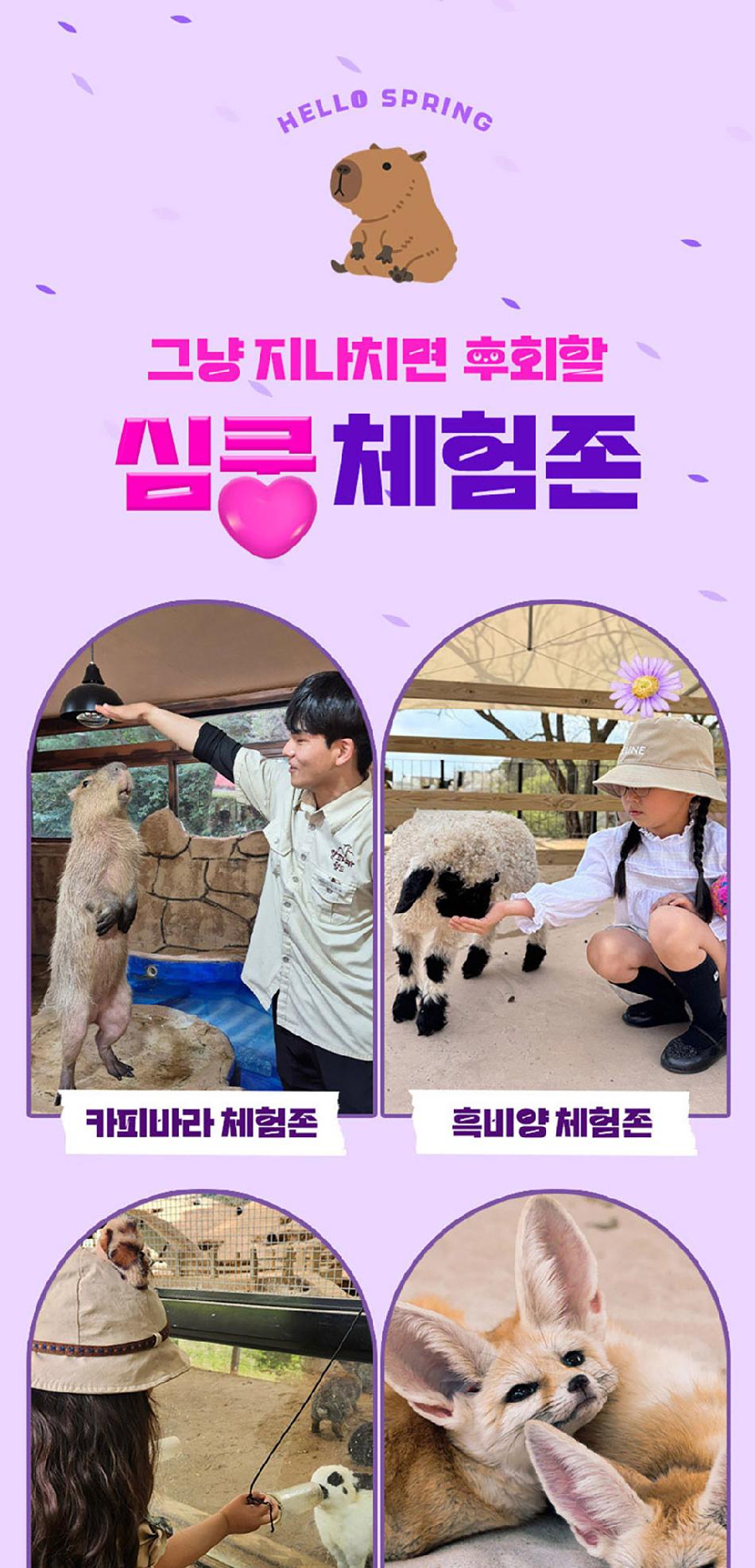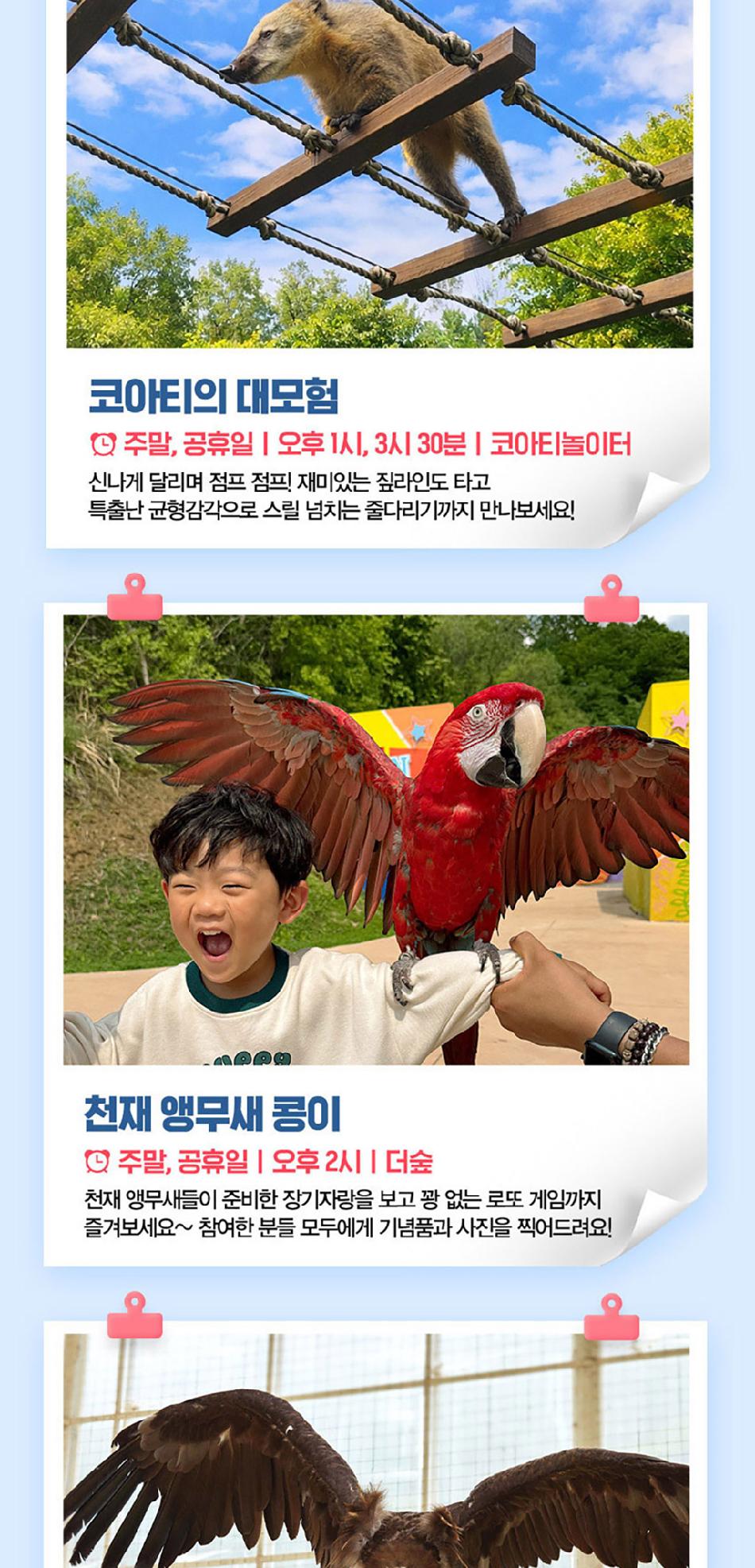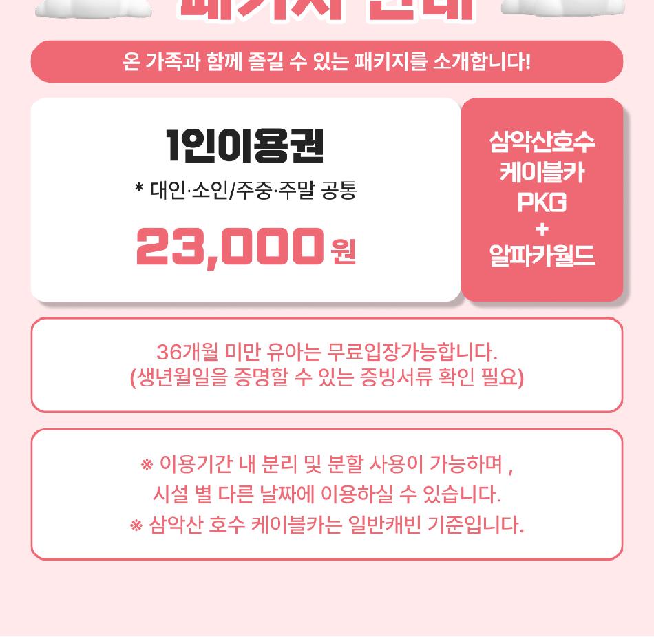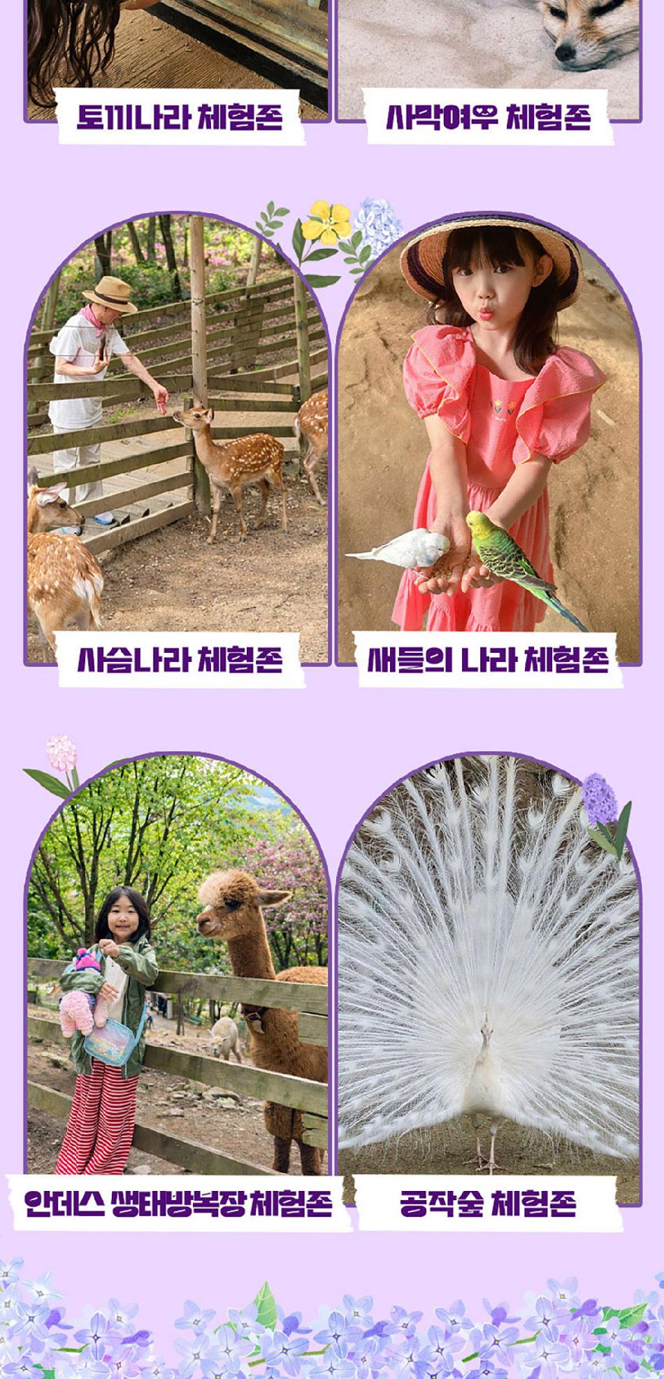 알파카월드 안내사항 * 알파카야 이리와 이벤트는 매일 오전 10시 10분에 시작이며, 10시까지 입장해주셔야 참여 가능합니다. * 동물들의 안전을 위해 음식물 및 반려동물의 출입이 제한됩니다.(맹인 안내견 제외) * 분실물 문의는 1899-2250으로 연락 주시면 신속하게 처리해 드리겠습니다. * 동물 알레르기가 있으신 분들은 체험 보다는 관람 하시는 것을 권유드립니다. * 주차공간이 충분히 마련되어 있으며 주차비는 무료입니다. * 알파카와 힐링산책은 현장에서 별도 구매가 필요합니다. * 먹이체험시, 필요한 먹이는 파카코인 구매 후 코인을 이용해 구매부탁드립니다. - (파카코인 1개당 먹이주기 체험 1회분) * 파카코인은 매표소(카드,현금 가능)/체험존파카코인교환기(현금만가능) 통해 구매 가능 - (1,000원당 파카코인1개 지급) * 경로우대 및 복지카드 소지자는 현장에서 입장권을 구매해주시기 바랍니다.