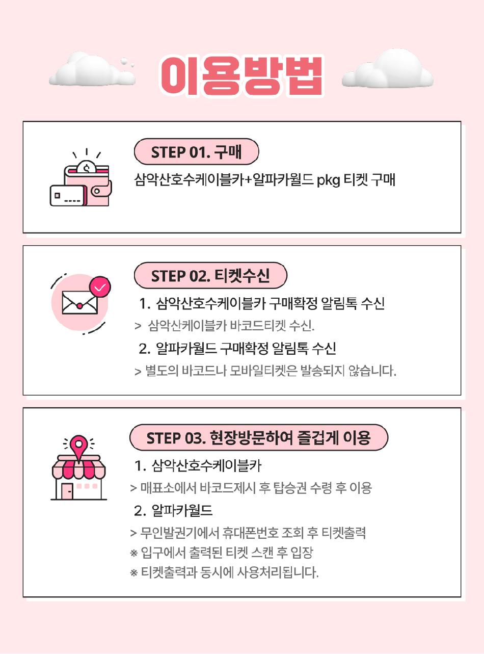 삼악산호수케이블카 * 1) 티켓구매 * 2) 삼악산케이블카 바코드티켓 수신 * 3) 매표소에서 바코드제시 후 탑승권 수령 후 이용