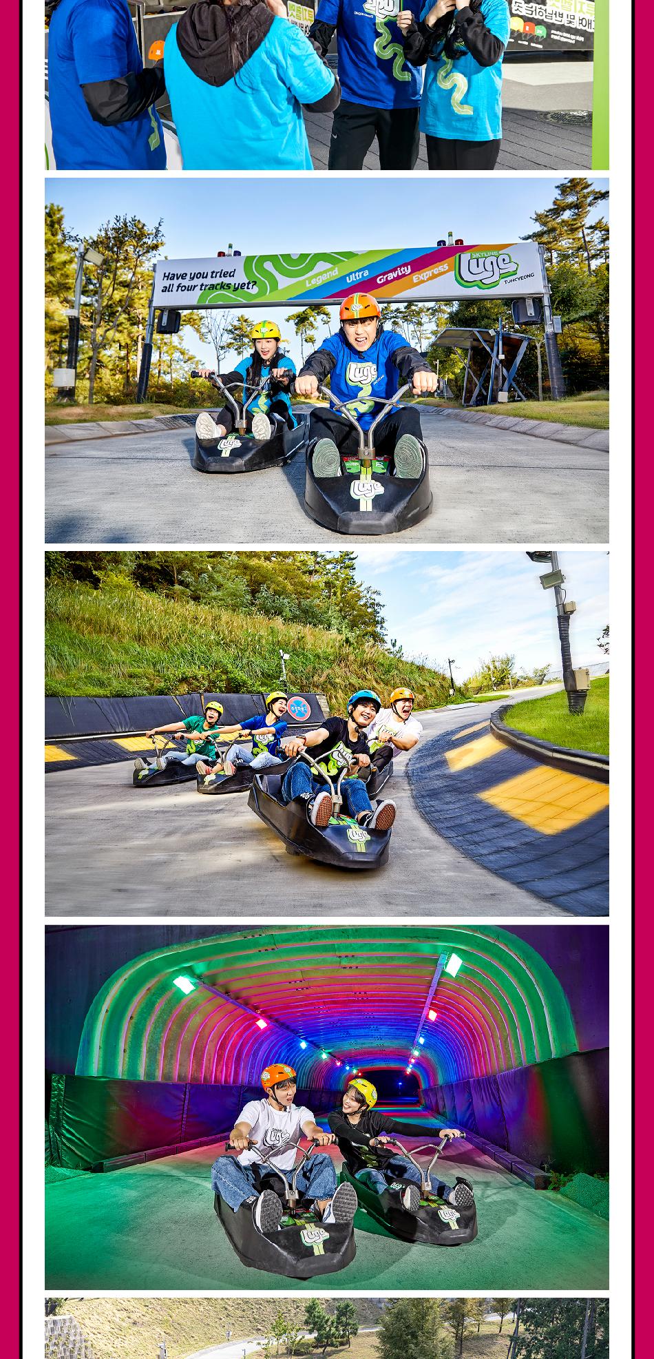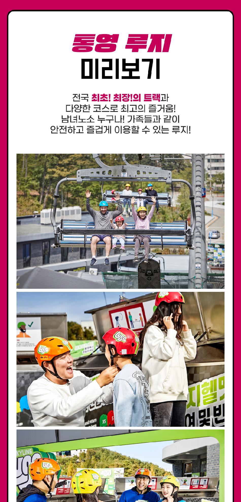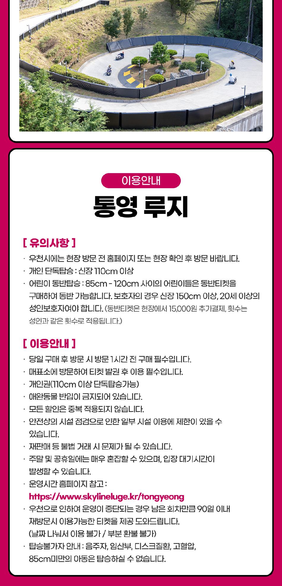 루지 유의사항 * 1) 우천 시에는 현장 방문전 홈페이지 또는 현장 확인 후 방문 바랍니다. * 2) 최소 이용가능 기준 - 개인 단독탑승 : 신장 110cm 이상 - 어린이 동반탑승 : 85cm - 120cm 사이의 어린이들은 어린이 동반티켓을 구매한 150cm 이상의 신장을 가진 20세 이상의 성인 보호자와 동반 탑승 하실 수 있습니다. (현장에서 15,000원 추가결제, 어린이 동반탑승권은 동반 탑승하는 성인과 같은 횟수로 적용됩니다.) * 3) 개인권(110cm 이상 단독탑승가능) * 4) 애완동물 반입이 금지되어 있습니다. * 5) 모든 할인은 중복 적용되지 않습니다. * 6) 안전상의 시설 점검으로 인한 일부 시설 이용에 제한이 있을 수 있습니다. * 7) 재판매 등 불법 거래 시 문제가 될 수 있습니다. * 8) 주말 및 공휴일에는 매우 혼잡할 수 있으며, 입장 대기시간이 발생할 수 있습니다. * 9) 우천으로 인하여 운영이 중단되는 경우 남은 회차만큼 90일내 재방문시 이용가능한 티켓을 제공 도와드립니다. (일자 나눠서 이용불가/부분 환불 불가) * 10) 음주자, 임산분, 디스크질환, 고혈압, 85cm 미만의 아동 탑승 불가