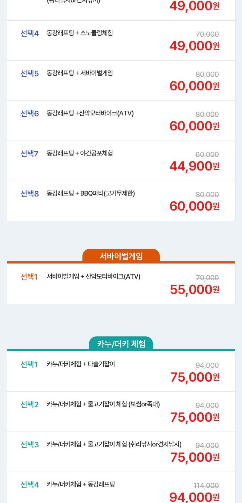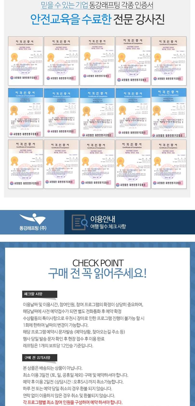 * 각 프로그램 별 최소 참여인원 모집 시 진행이 가능합니다. (래프팅 인원 미달 시 더키/카누로 진행될 수 있음)