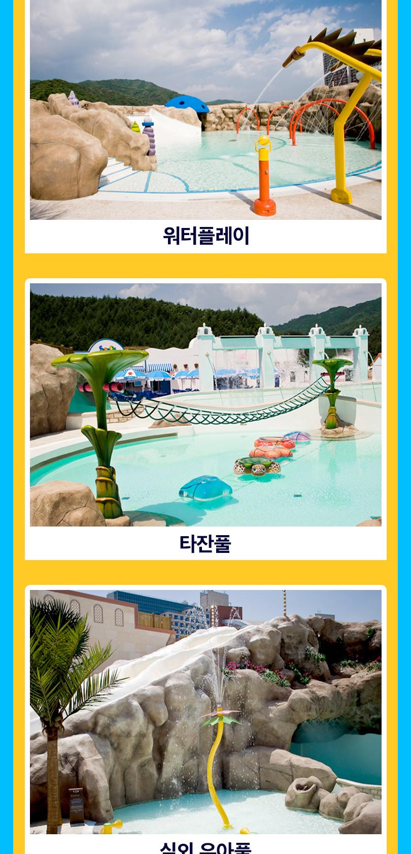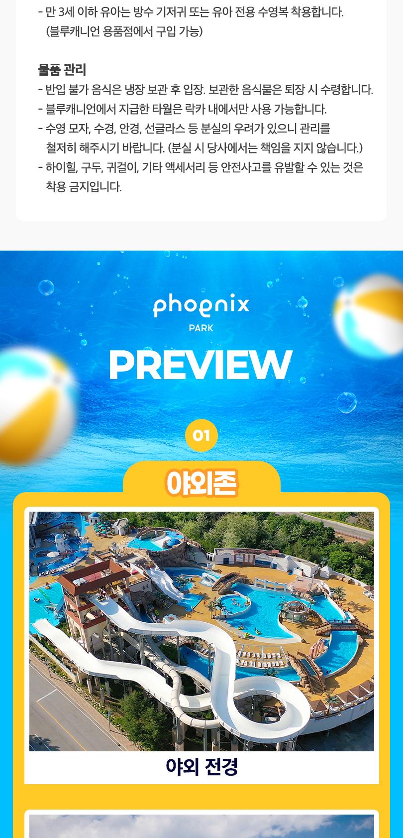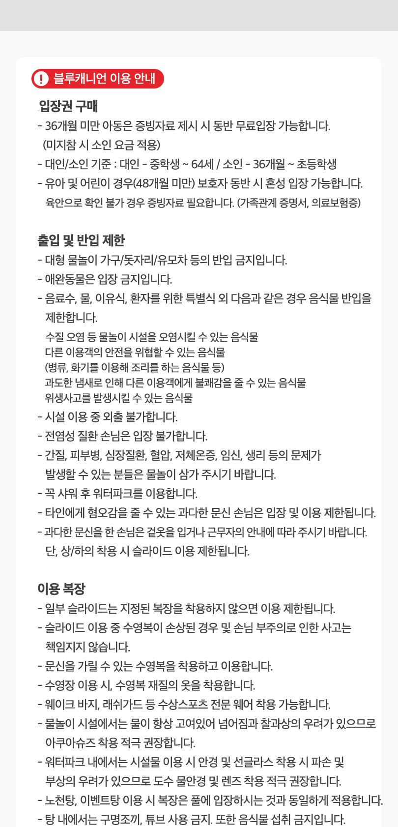 * 모바일 입장권(바코드) 미지참 시 이용 불가 * 발권 후 30분 내에 입장하셔야합니다. * 운영 마감시간 1시간 전 발권 마감. * 주중/주말/공휴일 구분없이 이용가능 * 구명조끼 미포함 상품이며, 수영복 대여점 미운영으로 입장 전 직접 준비 부탁드립니다. * 시설물 및 안전 점검으로 인하여 일부시설은 미운영 또는 교차운영 될 수 있습니다. * 이용 전 반드시 홈페이지에서 운영여부 및 운영시간, 어트랙션 상황, 유의사항 확인 후 이용바랍니다. * 36개월 미만 증빙서류 지참 시 동반 무료입장 가능.