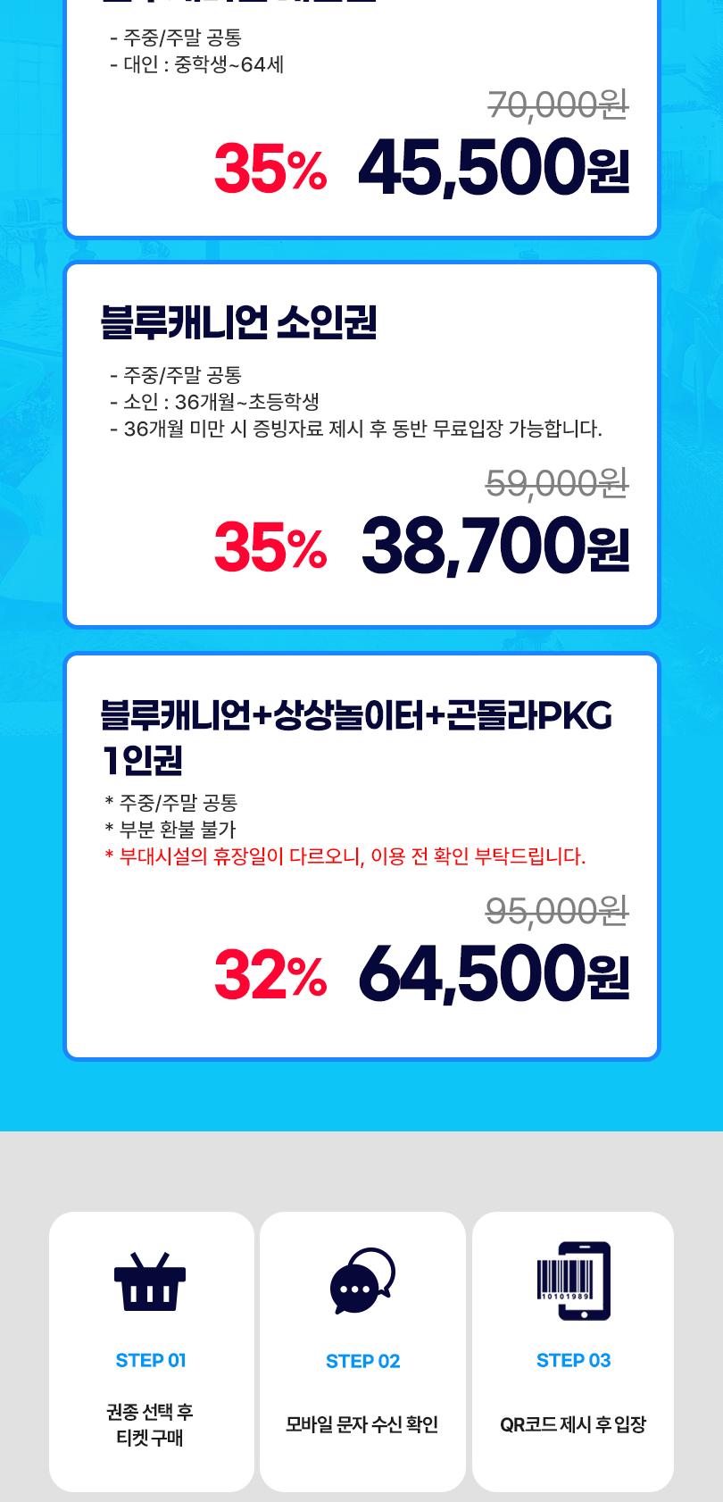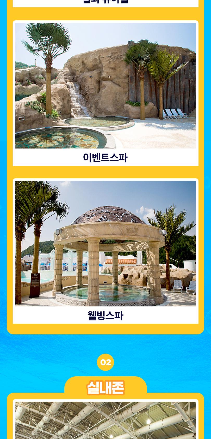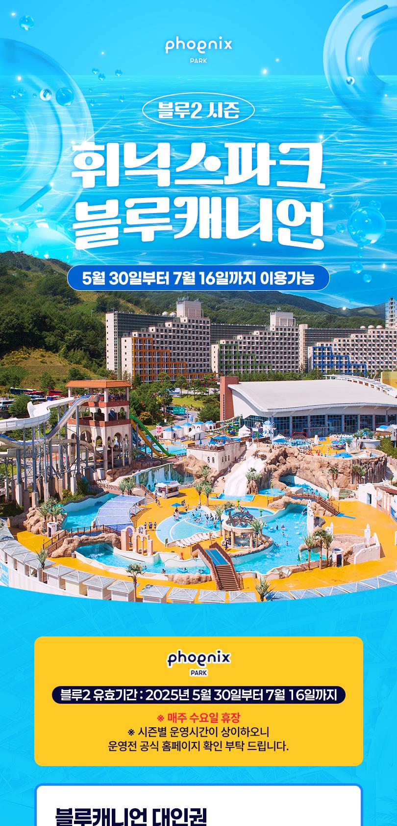 * 모바일 입장권(바코드) 미지참 시 이용 불가 * 발권 후 30분 내에 입장하셔야합니다. * 운영 마감시간 1시간 전 발권 마감. * 주중/주말/공휴일 구분없이 이용가능 * 구명조끼 미포함 상품이며, 수영복 대여점 미운영으로 입장 전 직접 준비 부탁드립니다. * 시설물 및 안전 점검으로 인하여 일부시설은 미운영 또는 교차운영 될 수 있습니다. * 이용 전 반드시 홈페이지에서 운영여부 및 운영시간, 어트랙션 상황, 유의사항 확인 후 이용바랍니다. * 36개월 미만 증빙서류 지참 시 동반 무료입장 가능.